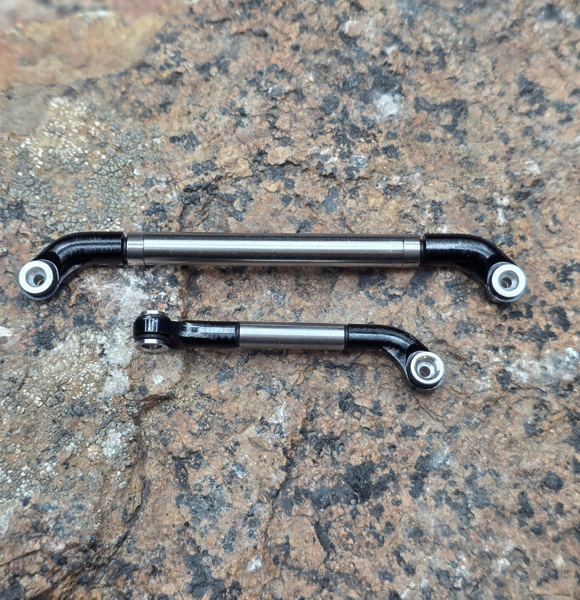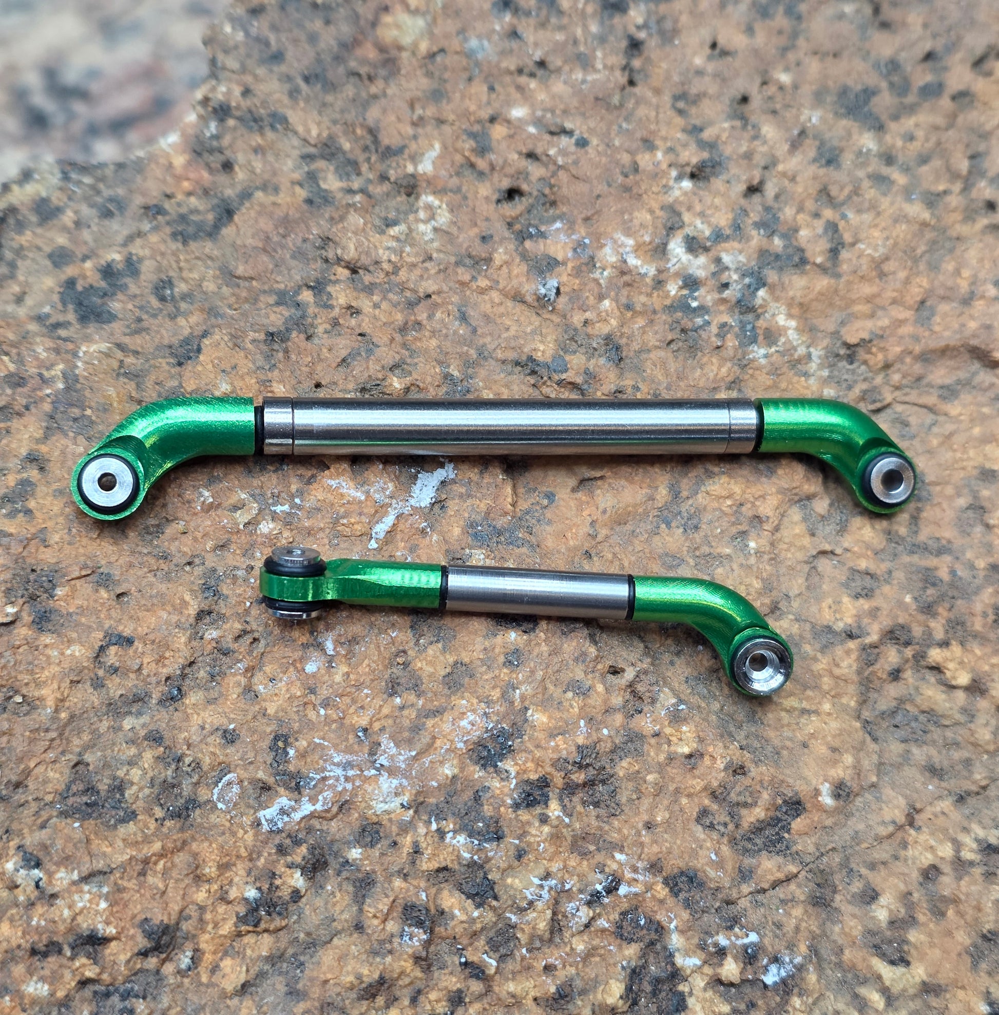This uses the new V2 Offset Rod ends but with a CNC'd Rolling stainless steel tube instead of a full row bearings. There is one bearing on either side of the Steel roller to keep things smooth and flowing allowing the Steel roller to move freely as it gets caught up on any snags. The R.S.S.L weighs slightly more than the 5mm R.B.S.L and is considerably stiffer. Toe out can still be achieved but will need to add the supplied O-rings to take up any gap once unthreading the rod ends for toe out.
