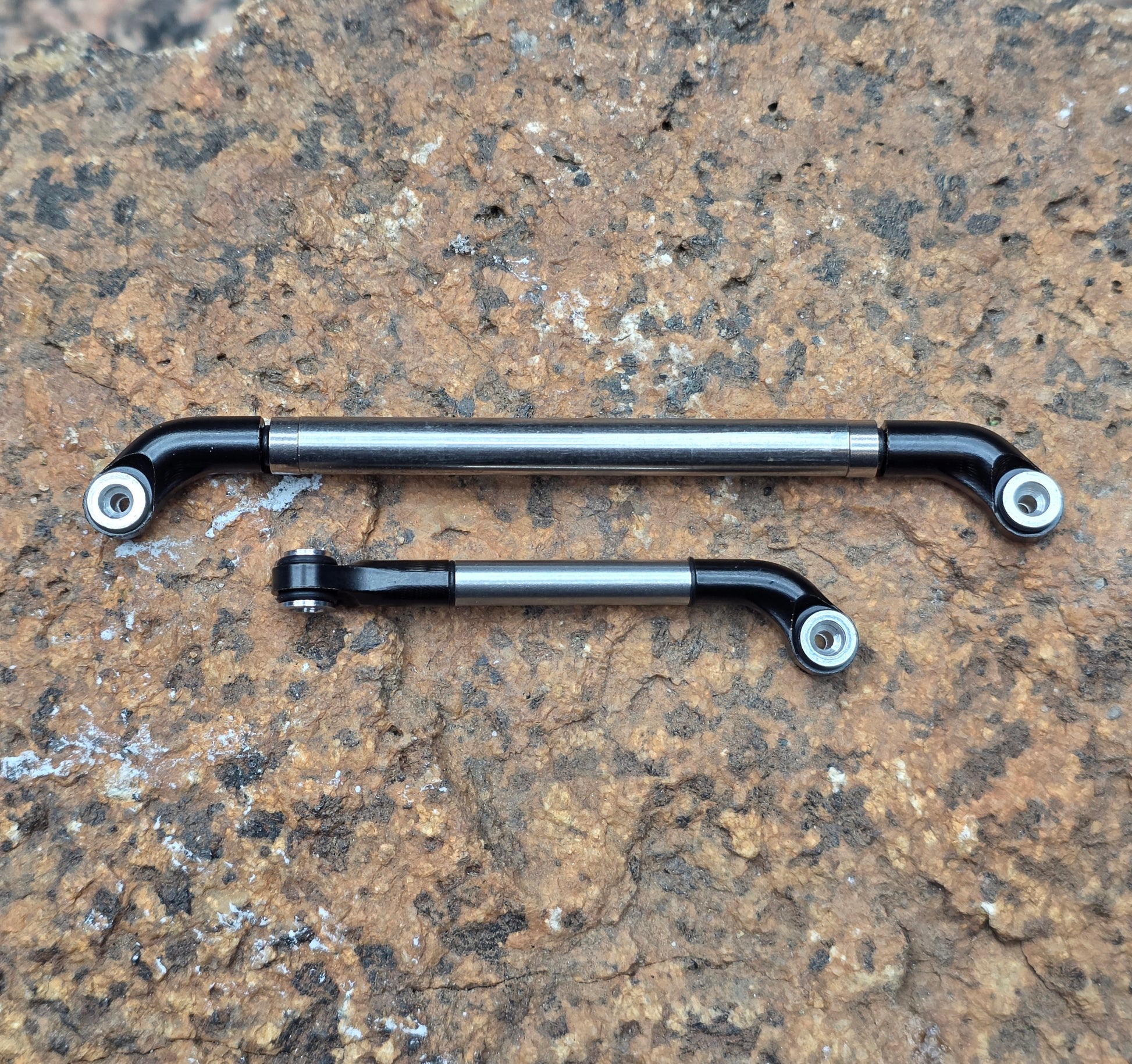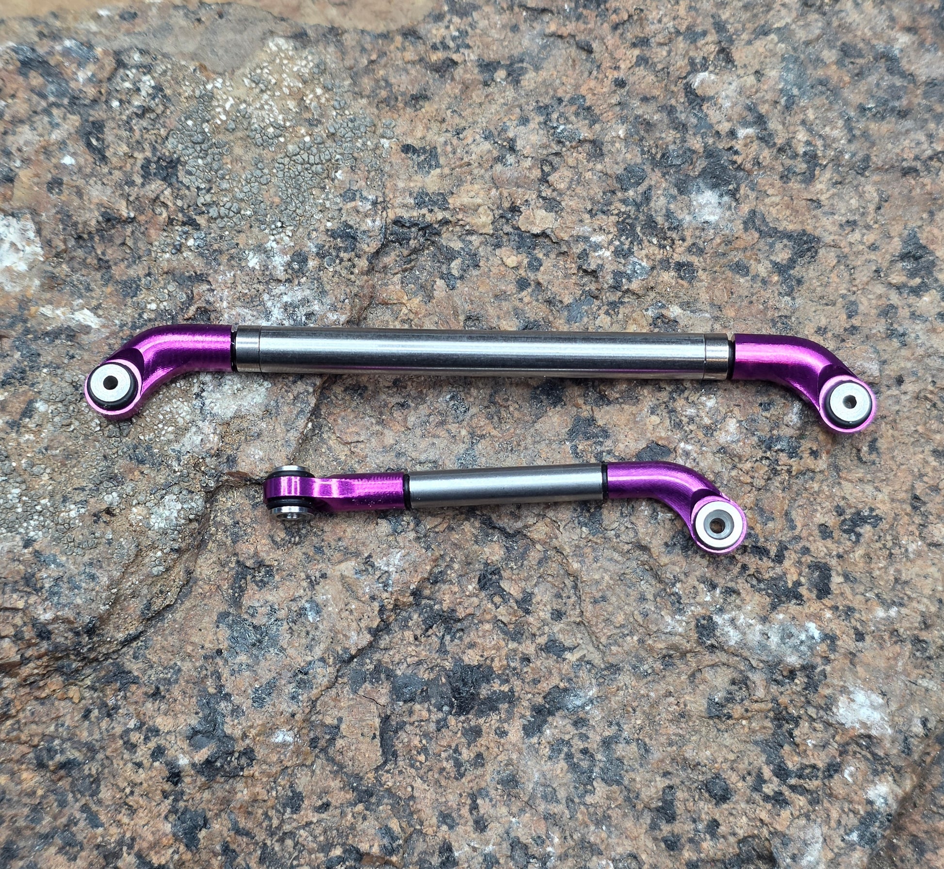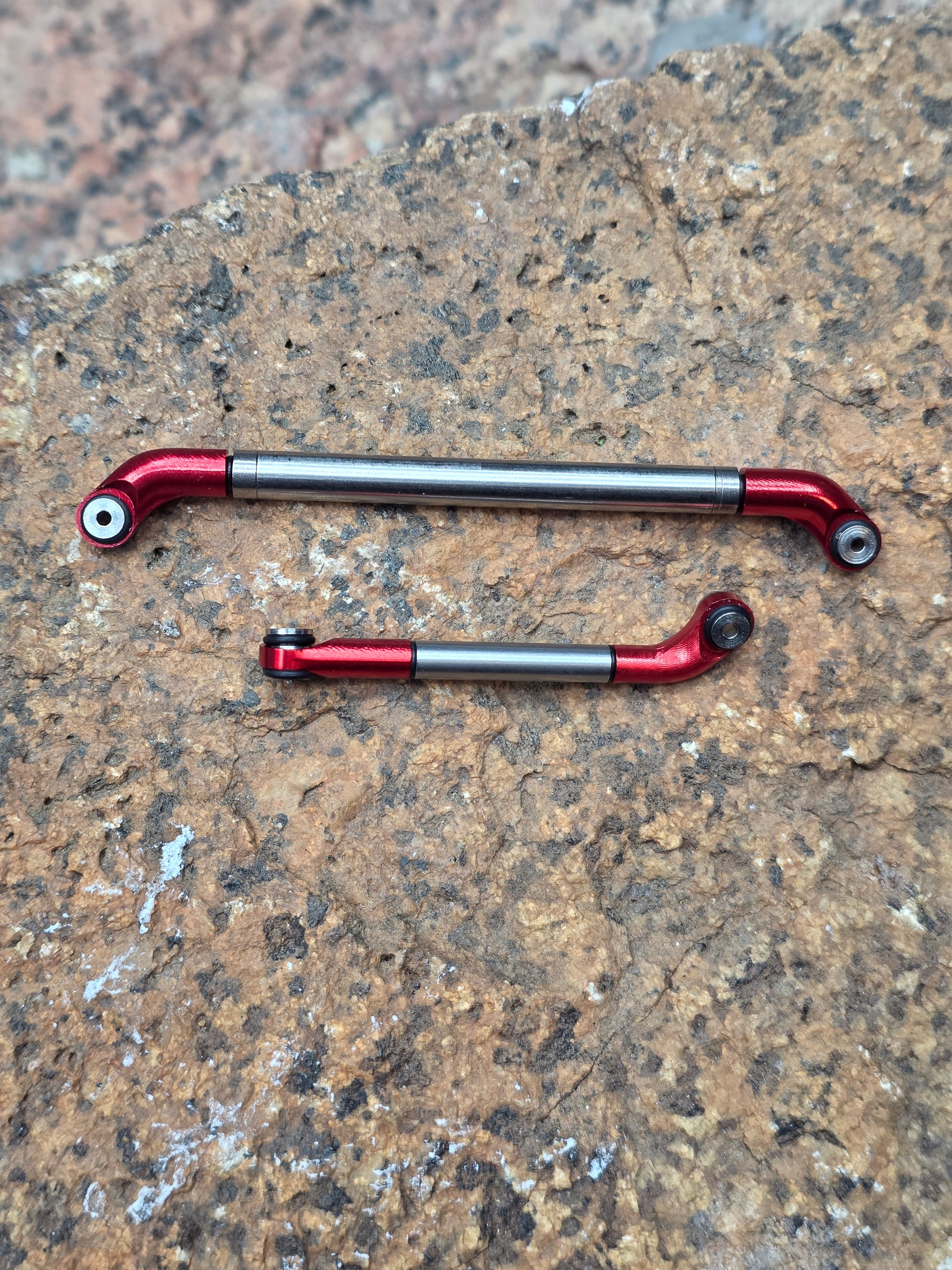 This uses the new V2 Offset Rod ends but with a CNC'd Rolling stainless steel tube instead of a full row bearings. There is one bearing on either side of the Steel roller to keep things smooth and flowing allowing the Steel roller to move freely as it gets caught up on any snags. The R.S.S.L weighs slightly more than the 5mm R.B.S.L and is considerably stiffer. Toe out can still be achieved but will need to add the supplied O-rings to take up any gap once unthreading the rod ends for toe out.