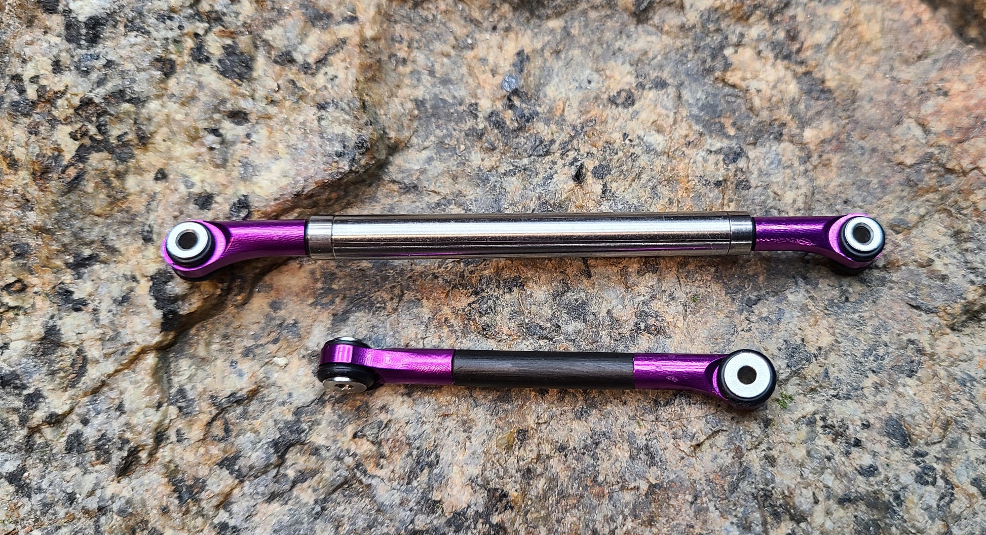 This uses the new V2 Offset Rod ends but with a CNC'd Rolling stainless steel tube instead of a full row bearings. There is one bearing on either side of the Steel roller to keep things smooth and flowing allowing the Steel roller to move freely as it gets caught up on any snags. The R.S.S.L weighs slightly more than the 5mm R.B.S.L and is considerably stiffer. Toe out can still be achieved but will need to add the supplied O-rings to take up any gap once unthreading the rod ends for toe out.